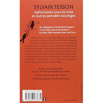 « Aphorisme sous la lune et autre pensées sauvages », aujourd'hui réédité en version livre poche, regroupe sur 170 pages les pensées fulgurantes, subtiles et souvent ironiques de Sylvain Tesson.Ces aphorismes ressemblent à leur auteur : lucide, parfois désabusé, toujours connecté à la nature et au monde sauvage et dont la culture transparait en filigrane. Ses pensées s'associent à une parfaite maîtrise des mots, ce qui permet à Tesson de proposer aussi de très jolis traits d'esprits.Ce livre se lit avec plaisir, en continu ou en « picorant » au hasard. L'édition Pocket est remarquable : beau papier, mise en page très aérée agrémentée de dessins de Michel Pinosa et d'une remarquable preface.